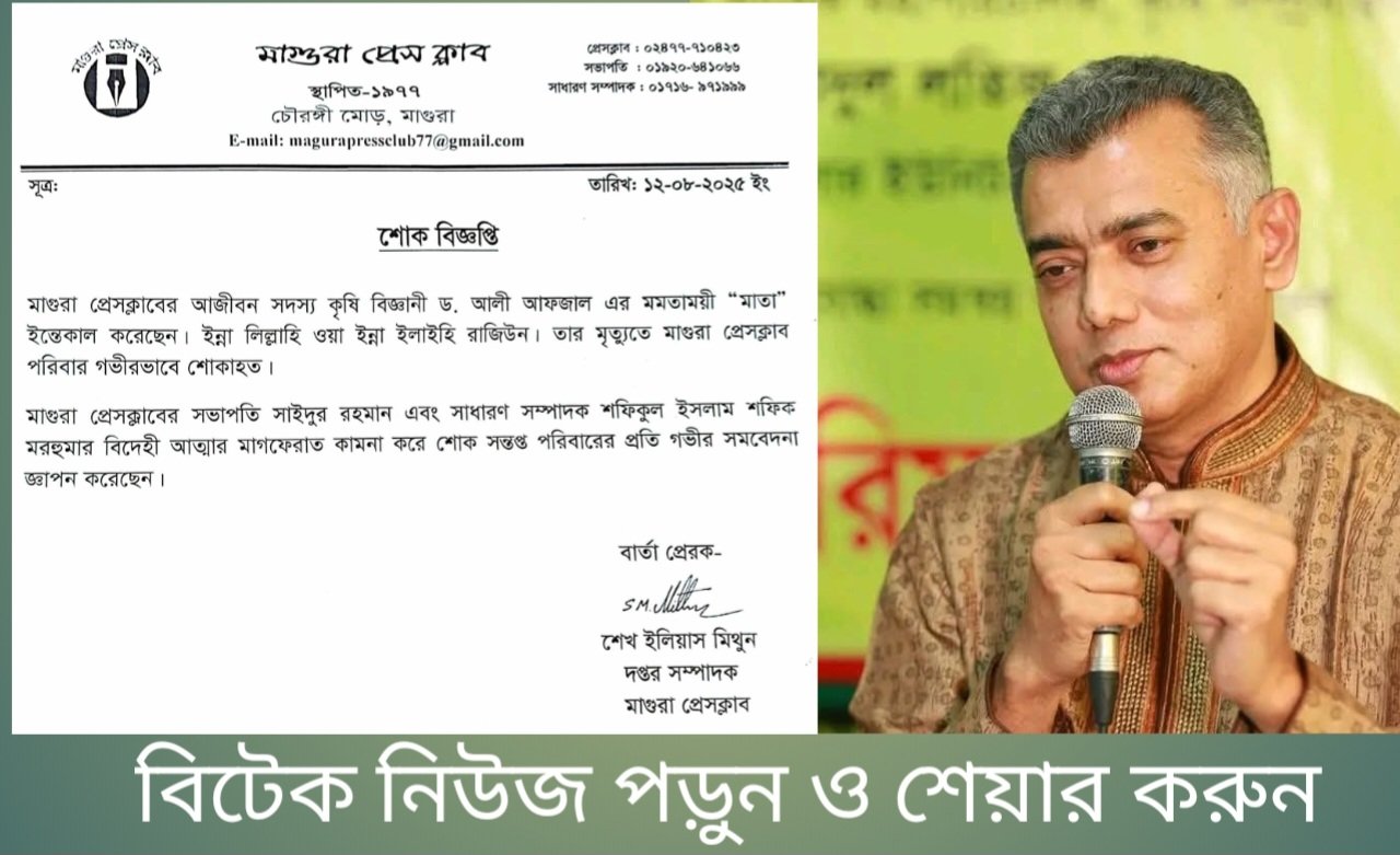 কৃষি বিজ্ঞানী ও কৃষিবিদ গ্রুপের ব্যবস্থাপনা পরিচালক মাগুরা প্রেসক্লাবের আজীবন সদস্য ড. আলী আফজালের মমতাময়ী মায়ের মৃত্যুতে গভীর শোক প্রকাশ করেছে মাগুরা প্রেসক্লাবের সভাপতি অধ্যাপক সাইদুর রহমান ও সাধারণ সম্পাদক শফিকুল ইসলাম শফিক।