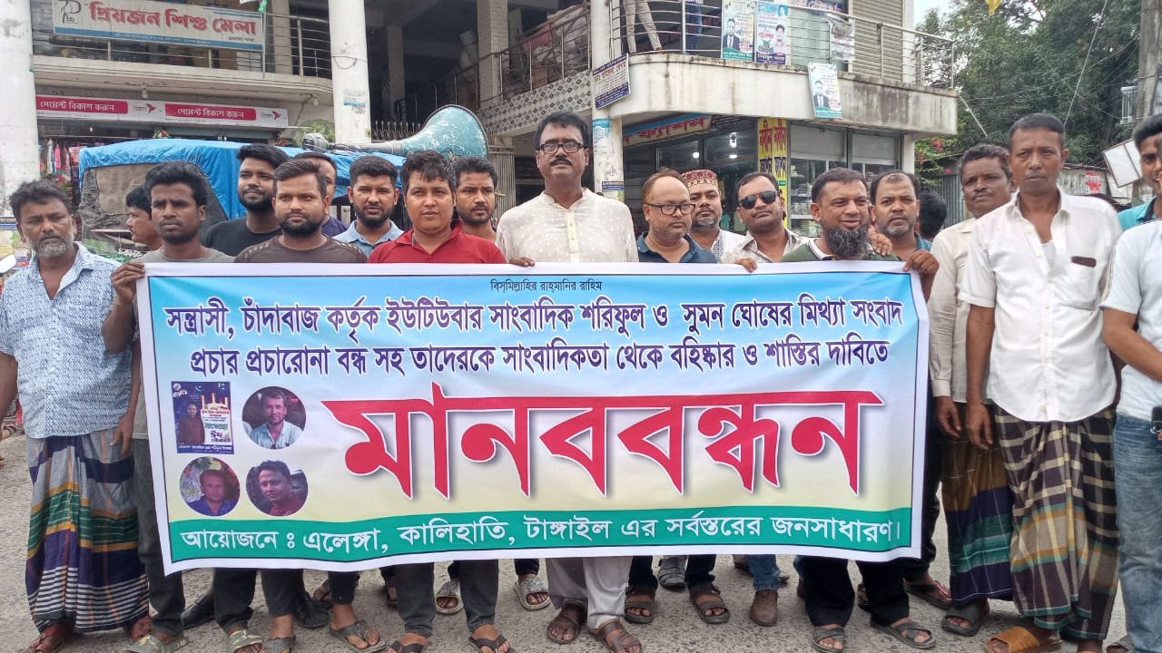 রবিবার (২৭ জুলাই) বিকেলে এলেঙ্গা সরকারী শামসুল হক ডিগ্রী কলেজ মোড়ে শতাধিক মানুষ ব্যানার হাতে জড়ো হয়ে প্রতিবাদ জানান। ব্যানারে লেখা ছিল: সন্ত্রাসী, চাঁদাবাজ কর্তৃক ইউটিউবার সাংবাদিক শরিফুল ও সুমন ঘোষের মিথ্যা সংবাদ প্রচার প্রচারণা বন্ধ সহ তাদেরকে সাংবাদিকতা থেকে বহিষ্কার ও শাস্তির দাবিতে মানববন্ধন।