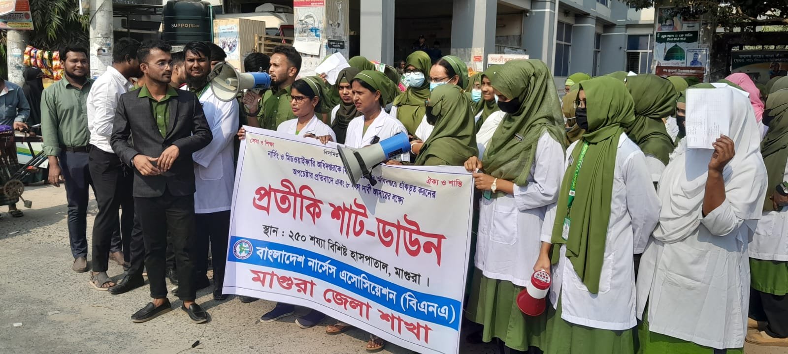 মাগুরায় নার্সিং ও মিডওয়াইফারি অধিদপ্তরকে বিলুপ্ত করে ভিন্ন অধিদপ্তরে একিভূত করনের অপচেষ্টার প্রতিবাদে এবং ৮ দফা দাবি আদায়ের লক্ষ্যে প্রতিকি শাটডাউন কর্মসূচি পালিত হয়েছে। আজ রোববার সকাল ১১ টায় মাগুরা ২৫০ শয্যা সদর হাসপাতালের সামনে এ কর্মসূচি পালন করে বাংলাদেশ নার্সেস এসোসিয়েশন মাগুরা জেলা শাখা। কর্মসূচিতে নেতারা জানান, আগামী ২ ডিসেম্বরের মধ্যে সরকার সকল কর্মসূচি মেলে না নিলে সারা বাংলাদেশে কমপ্লিট শাটডাউন অনুষ্ঠিত হবে।